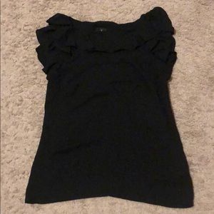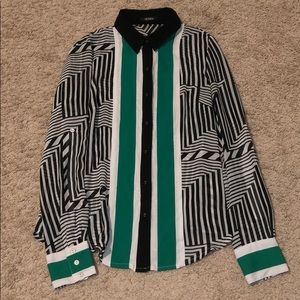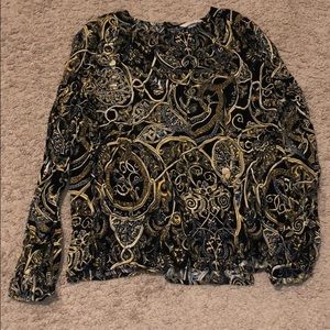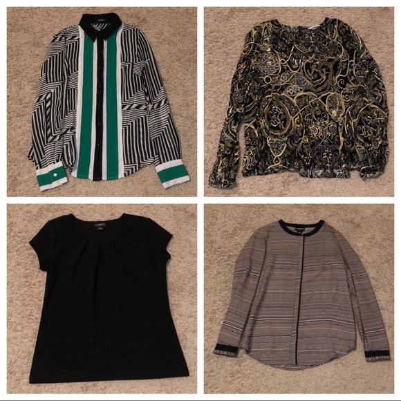 Good condition. The all black shirt is Liz Claiborne size S. The gold chain shirt is H&M size 8. The pink and gold stripe shirt is Liz Claiborne size S tall. The green and white shirt is mesh (see through) size M. The all black shirt with the ruffle sleeves is Worthington size S
