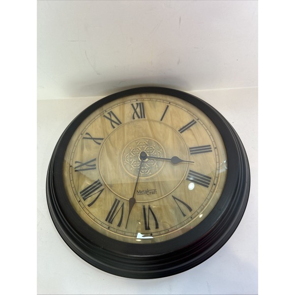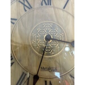 The Metal Craft Marble Face/Stained Glass Look Wall Clock is a contemporary style hanging wall clock powered by a battery-operated quartz movement. The clock features a metal frame and a unique design that resembles a marble face with a stained glass look. Standing at 11 inches tall and 11 inches long, this modern clock adds a touch of elegance to any home décor setting.
