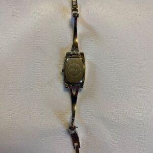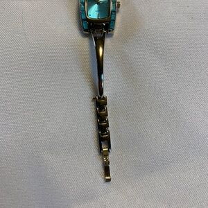 Working Minicci Silver Tone with Blue Acrylic Accents Watch with Brand New Battery! The watch face is a beautiful blue. On both sides of the Watch face there are rows of blue acrylic rectangular and faceted cabochons. They are scuffed along the facets giving them a frosted look. It features a stainless steel back and Japan Movement. Quartz. It fits approximately up to a 6.5” inch wrist.