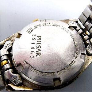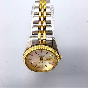 Vintage Pulsar Women’s Watch. Watch is gold and silver and includes a day-date display. The battery has been replaced and the watch works perfectly.