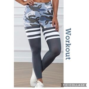 Cute! Camouflage & gray leggings. White stripes around knees.