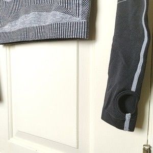 Features: Contoured; seamless design; ribbed hem; thumbholes at cuffs; moisture wicking fabric to help keep you cool and dry