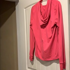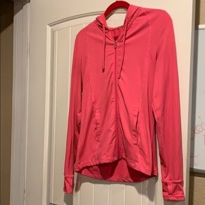 Super comfy workout jacket. There are openings in the hand for your thumbs as well! Stretchy , form fitting fabric.