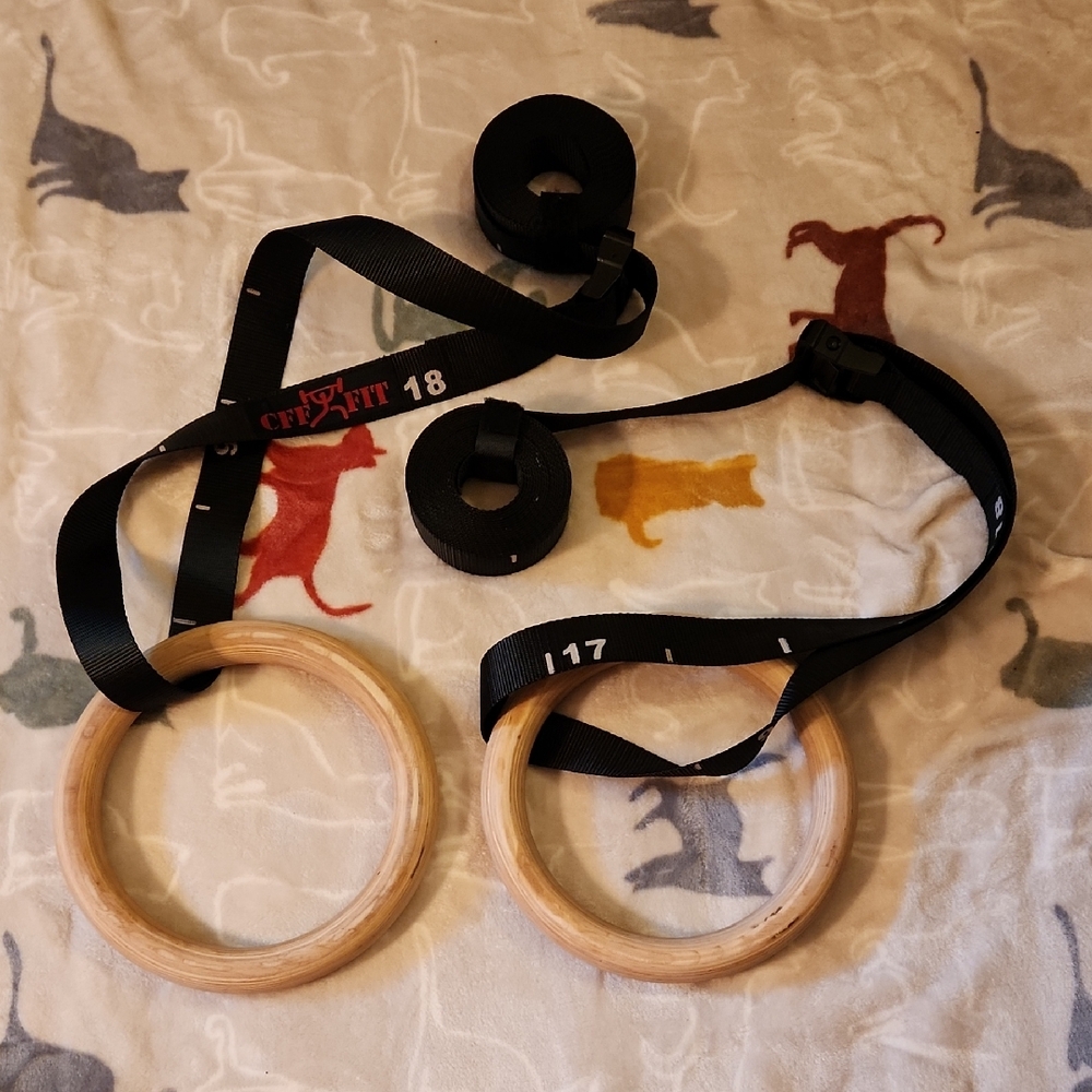 Pair of wooden crossfit/gymnastics rings with adjustable straps, from CFFFIT. NEVER USED. 18 foot straps.