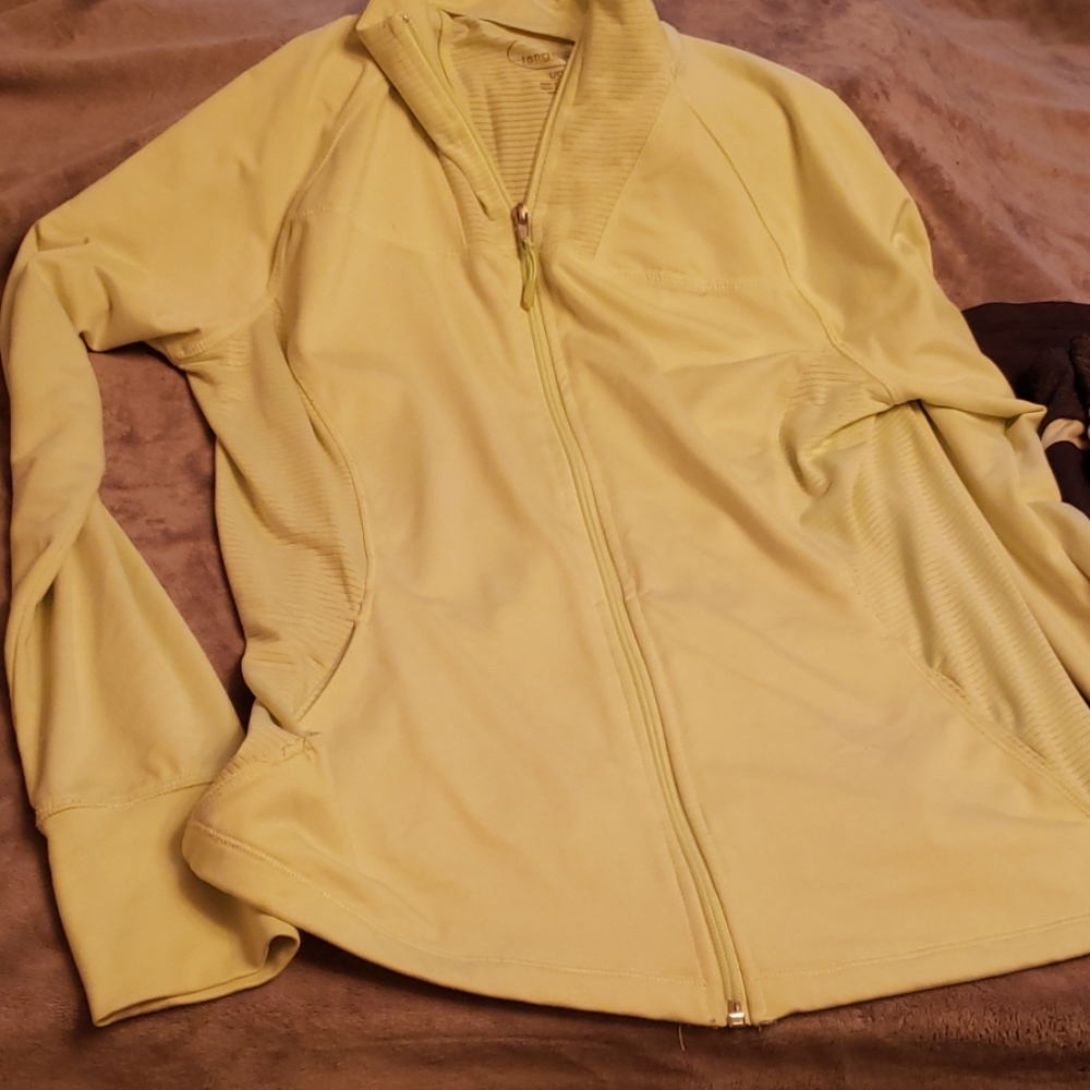 Small pants, Large zipper top (fits more like a Med) for working out, soccer games, running errands. Super cozy, good used condition. Color is a pale chartreuse-lime green, grey pant
