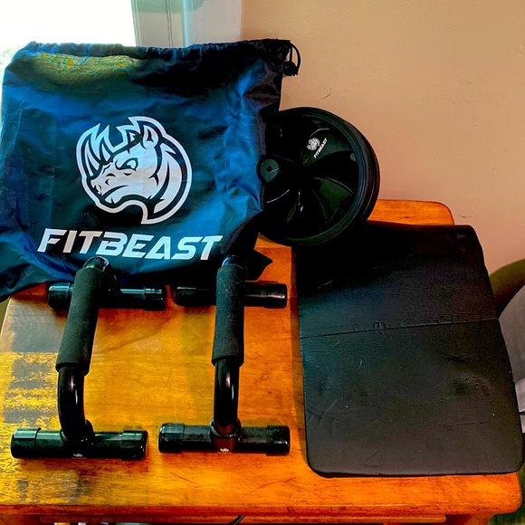 Work out set! Includes ab roller, knee pad, push-up bars and storage bag.