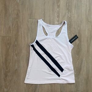 A light blush pink cropped tank with a racerback cut for maximum mobility and breathability. The standout feature is the two bold diagonal black stripes across the front, giving it a sleek, athletic look. The fit is slightly loose for comfort, making it ideal for both workouts and casual wear.High-waisted leggings with a modern color-block design. The top half is solid black, offering a slimming effect, while the lower half features matching blush pink panels with angular cuts and thin white piping that complements the top. These leggings offer full coverage with a snug, supportive fit, ideal for all types of workouts.