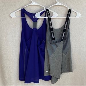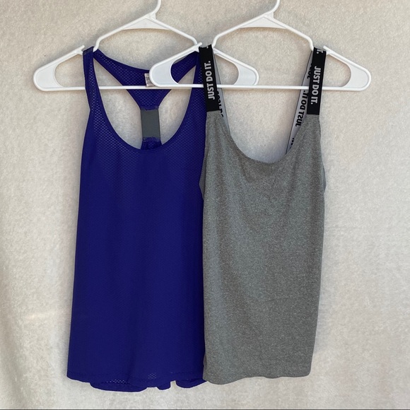 Workout Tank BUNDLE. Purple: Under Armor size Large- slight pull on front (pictured) but not super noticeable. Grey: Nike cross back size Medium. Brand new- worn once. I would say they both fit similarly and a M or L could wear them.