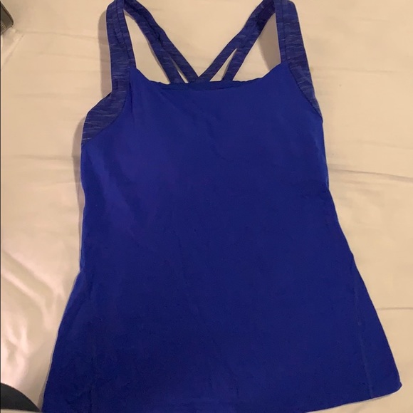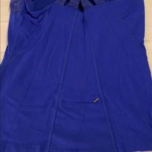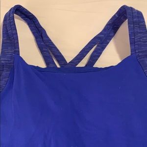 Cobalt blue fitted workout top with bra cups. Twisted back straps with key pocket in the back. No tags for brand or actual size- but fits 12-14. And B-C cup. Excellent condition.