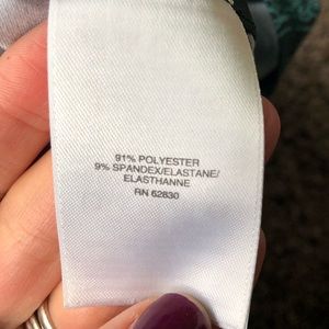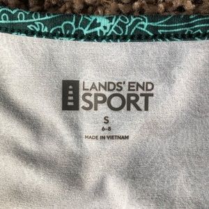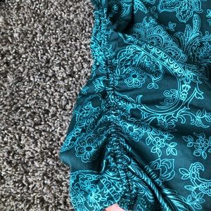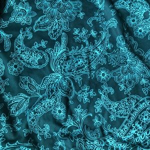 EUC Long sleeve active/sport top. Lightweight and dries quickly. Flattering ruching on sides. Playful paisley pattern in aqua set against a darker green background.