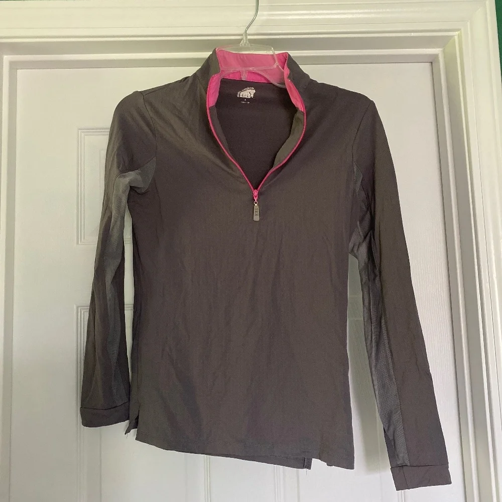 Half zip workout top, arms have netting on them. Grey with pink edging