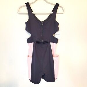 Workout athletic romper. Zippered lined top with cut out sides, color block, two deep pockets, bodycon stretch.
