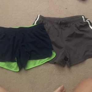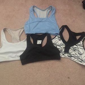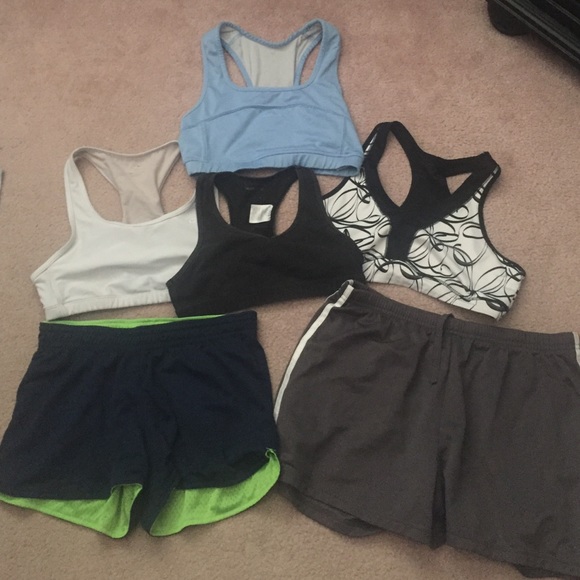 Both shorts are champion brand! Navy blue/green is reversible. Blue-S Grey-S/M. 4 sports bras! Black danskin v neck. Size small. 32-34. White nike scoop neck. Size Medium. Black and white tek gear v neck. Size medium. Light blue reebok scoop neck. Size medium. All is used but in good condition! No holes or flaws besides slight pulling. Nike white also has small stain on inside of bra.