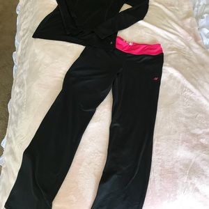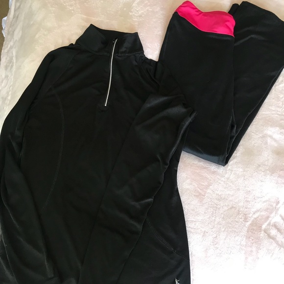Long sleeve is in perfect condition! It is by an off brand! Super silky and cute! The pants are by new balance and have a small imperfection on the bottom front side of the pants!!! There was a hole but were professionally fixed! You cannot see it when on! Offers welcome! Both are size large