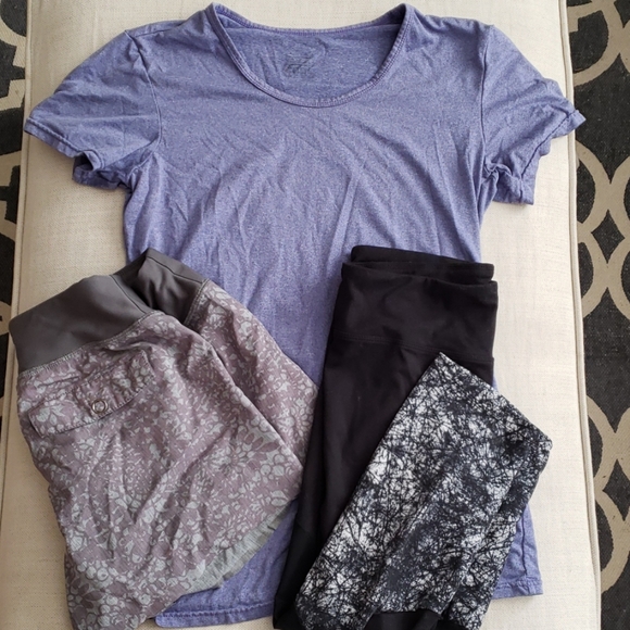 Excellent used condition, purple shirt, gray running shorts and black capri leggings! Leggings have a worn out brand logo on back and are a thinner material with mesh backs of the legs. Running shorts are Mondetta, high quality with drawstring and functional back pockets, perfect for warm workout /running days. Shirt is a nice longer length, soft and stretchy, unknown brand. They are all size small. Bundle more and save more!