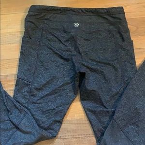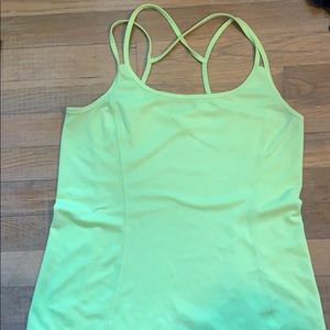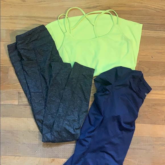 Leggings, yellow workout tank (minor discoloration pictured), and navy dri-fit shirt