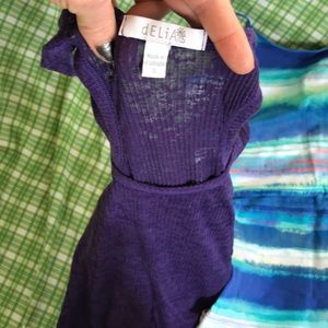 Everything excellent condition purple top very light then a bit see-through shorts are intact no holes rips or tears blue tank top new without tags resell or reuse