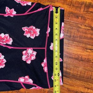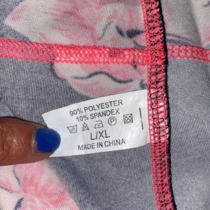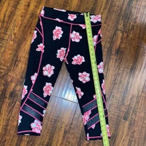 Cute workout pants black with pink and white flowers. Pink stitching. Two see thru stripes at bottom with black see thru overlay. Size large.