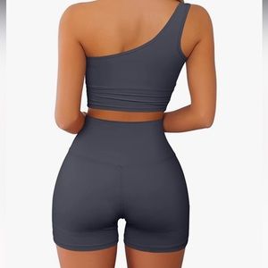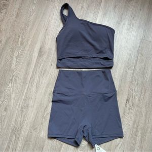 One Shoulder Sport Bra with padding and High Waist Yoga Shorts. The material is buttery soft.