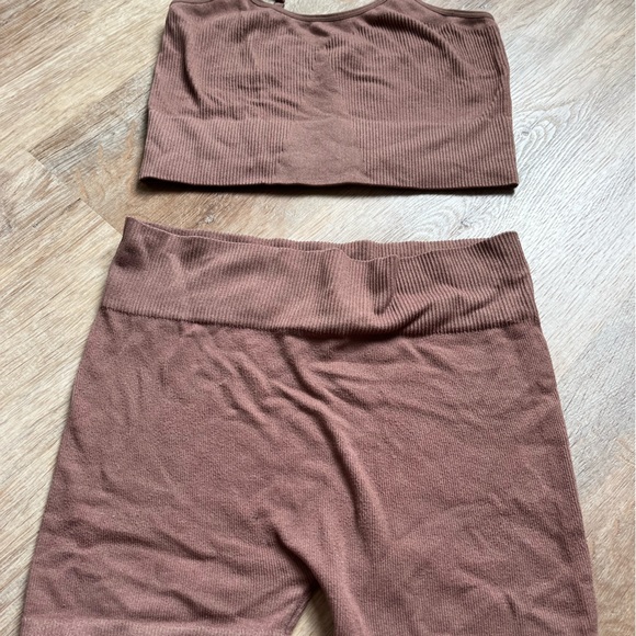 Brown stretchy and soft workout set. Shorts and tank.