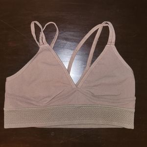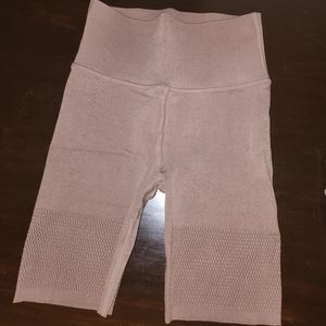 brown workout set with a mesh design on the end of the shorts and under the bust.