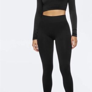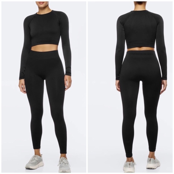 Sleek black leggings and crop top set by Prozis. Ideal for workouts or casual outings. Comfortable and stylish.