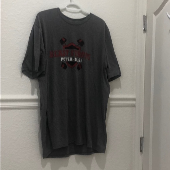 This is a workout tshirt. The front says Beast Strong Powerhouse. The back says strength starts here in red.