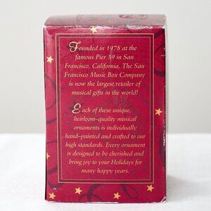 Vintage San Francisco Music Box Company “Over the Rainbow” castle Christmas ornament with original box included. Hand painted musical ornament in good, working condition. Press the bottom and the ornament plays “Over the Rainbow” musical tune. Ornament approximately 3” tall. Please ask any questions before purchasing.