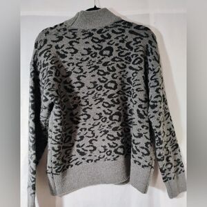 Cozy charcoal sweater with a soft texture. Mock neck with fun animal print. Ribbed trim. Good condition.