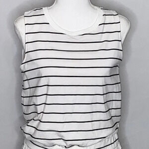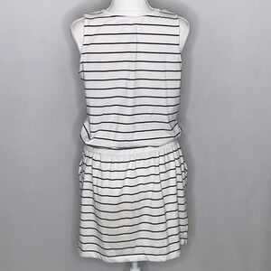Workshop Republic Clothing Sleeveless Drawstring Waist Striped Dress in a size small. Good pre-owned condition. Minor pilling from wash wear some loose threads (shown in pics) on the top stitching. Ribbed crew neck, sleeveless, black and white stripes, drawstring waist, pockets on both sides of skirt piece. Very soft tee shirt like fabric. Approximate measurements: 18" bust, 35" length.