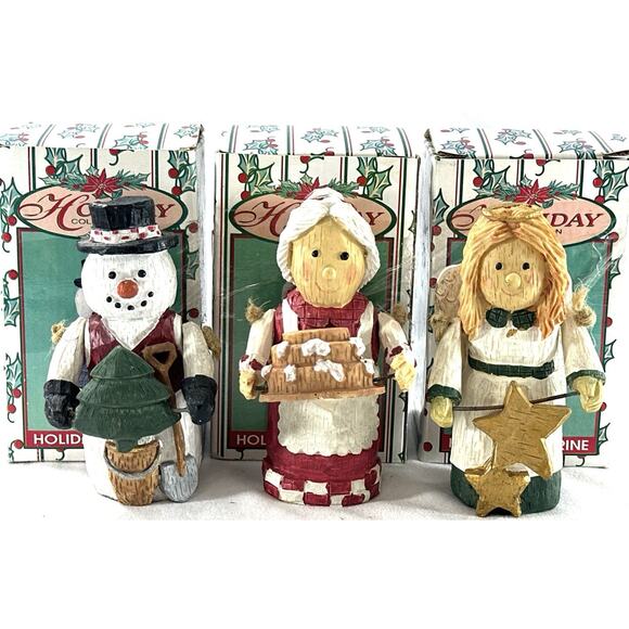 Vintage World Bazaars Inc. “Holiday Collection” figurine trio featuring a snowman with tree, Mrs. Claus with gingerbread cake, and an angel with golden stars. Each hand-painted resin figure stands about 5” tall with a carved-wood look. Includes all three original boxes. Excellent pre-owned condition; minimal shelf wear. Perfect for Christmas decorating or gifting.