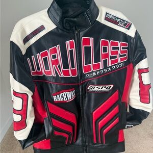 Stylish leather jacket with bold 'World Class' design. Features red, black, and white colors. Perfect for racing enthusiasts.