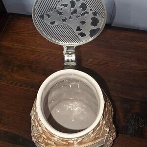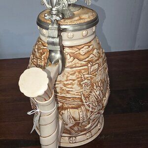 The stein lid features a pewter eagle with wings spread wide; inside the lid, there is a Dalmatian dog etched in the metal.
