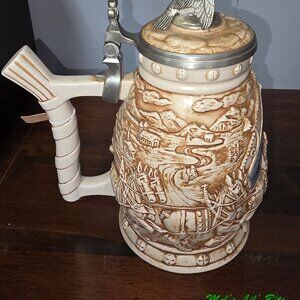 Other than the eagle on the lid, I think the most striking feature of this Budweiser stein is the raised relief of the famous Anheuser Busch Clydesdales wagon team pulling the Budweiser/Anheuser-Busch wagon in a rich brown tones with a winter scenic background.