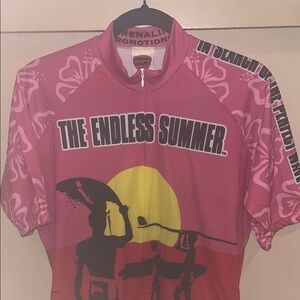 Embrace the spirit of adventure with pink cycling shirt. Perfect for outdoor enthusiasts. Freshly washed and air dried. Smoke and pet free home.