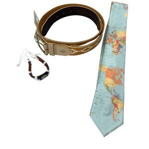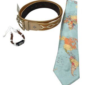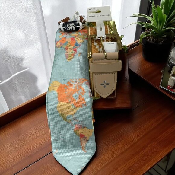 map tie, travel tie, globe necktie, elephant bracelet, tribal bracelet, mens gift set, world traveler gift, tan woven belt, boho menswear, geography teacher gift, wanderlust gift, novelty accessories, NWT belt, Sun and Stone belt, groomsmen accessories, explorer style