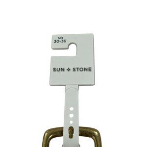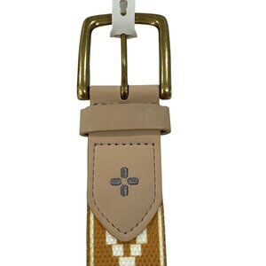 Sun + Stone Tan Woven Belt: Southwestern-style woven canvas belt in a warm tan hue with cream geometric accents. Features faux leather tips and a brushed brass buckle. Size S/M (30-36).