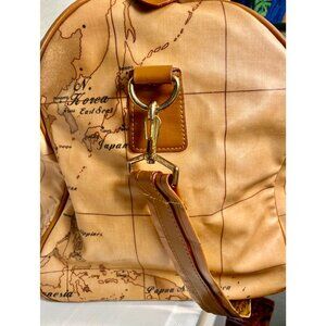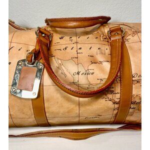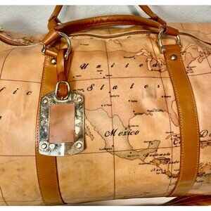 Beautiful preowned slightly used World Map Tan Duffle Bag. Has 2 twin handles and a long detachable shoulder strap. Has luggage tag. Made of Durable Plastic with Cloth lining. Very nice condition. Perfect for long weekends and short trips. When filled it Measures 19 inches in 10 inches in height and