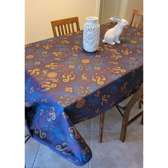Add a splash of bohemian elegance to your dining or kitchen space with this vibrant World Market tablecloth. Featuring a rich purple and blue paisley pattern, it brings an ethnic flair to any mealtime gathering. The high-quality 100% cotton material ensures durability and ease of care, with machine washable convenience. Measuring 60 inches in width and 90 inches in length, this rectangle tablecloth is ideally sized for a variety of table settings. Its earthy, colorful design captures the essence of boho chic, effortlessly enhancing your home decor with a touch of global sophistication.
