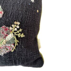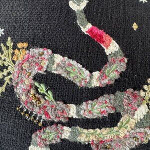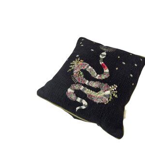 Add a bold touch to your space with this World Market decorative throw pillow featuring a detailed snake embroidery in earthy tones with metallic accents and celestial symbols. The black background gives it a mystical, witchy vibe, perfect for adding personality to your couch, bed, or reading nook. This square pillow has a soft fill, green piping, and an embroidered front with beading. Back side has slight wear near the seam (see photo), priced accordingly.