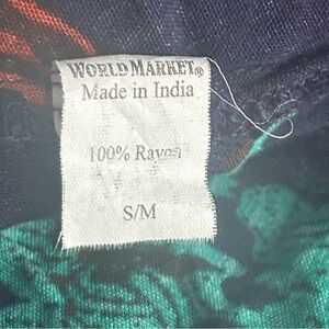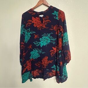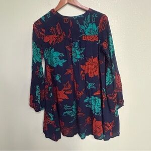 World Market Boho Floral Tunic Top S/M Navy Red Green Long Sleeve Rayon Peasant Style Shirt Blouse