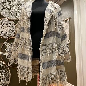 Chic and cozy open-front cardigan from World Market, featuring a boho-inspired striped design with fringe accents throughout. The neutral cream and black tones make it an easy layering piece for any season. Perfect for casual wear, travel, or adding texture to your outfit.