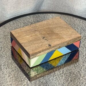 Handcrafted in India, our decorative box features a colorful modern-geo design and a meticulously carved, natural mango-wood lid. With its contrasting mix of materials, it makes a stylish addition to any accent table or cabinet. The perfect place to store tarot cards and other collectibles, it's also ideal for use as a jewelry box or a catchall for small trinkets and keepsakes.