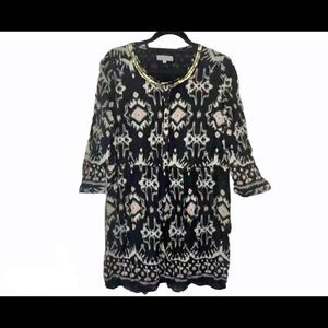 This darling Ikat print Boho dress is by World Market. It is fully lined with a button shirt dress styled front accented with a sequin neck line. And who doesn’t love pockets? It is a women’s size S/M. Very nice condition!