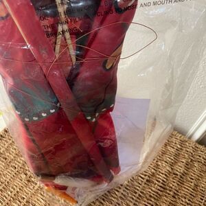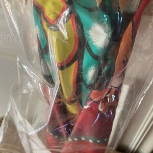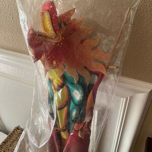Really cool! Bought years ago to hang on my grandsons bedroom wall! Then… decided to take it to the beach once… it rained that day, no wind. Back home it came. Still in original packaging. Never opened, never used. Really cool! 25 inches long! 2015. Really intricate thick cardboard like paper. Very colorful!! Wood not metal.