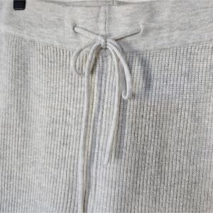 Cozy lounge pants are made in a ribbed sweater knit in ivory with gray. Designed for comfort with an adjustable drawstring waist and wide legs, they're soon to be a favorite in any loungewear collection. Size small to medium.