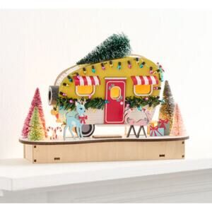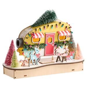 Roll vintage appeal into your Christmas village with our exclusive mid-century trailer, crafted of laser-cut wood and delightfully detailed. Featuring the cool vibes of classic MCM design, this light-up decoration is fitted with LED bulbs for a cozy touch. Festooned with garlands of greenery and strings of lights and accented with trees, flamingos and a retro deer, this Christmassy camper beams with festive flair.