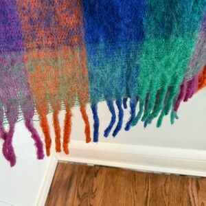 Colorful plaid wrap with fringe. Soft wool material. Perfect for adding warmth and style.