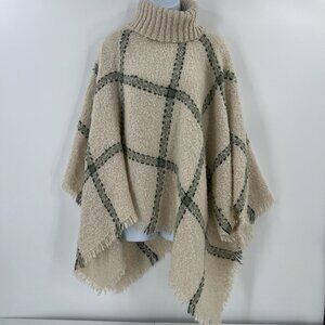 World Market OS Boucle Turtleneck Poncho Beige Sage Green Plaid Fringe Sweater