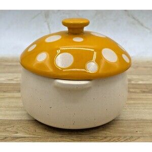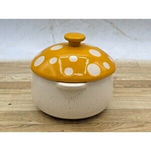 Condition: Pre-owned in excellent condition. No chips, cracks, stains or crazing. Bowl is made of stoneware ceramic and the mushroom topper is made of porcelain. Measures 4.5" diameter and about 5" tall with the mushroom topper. Has been washed and sanitized. Please see all photos for condition.
